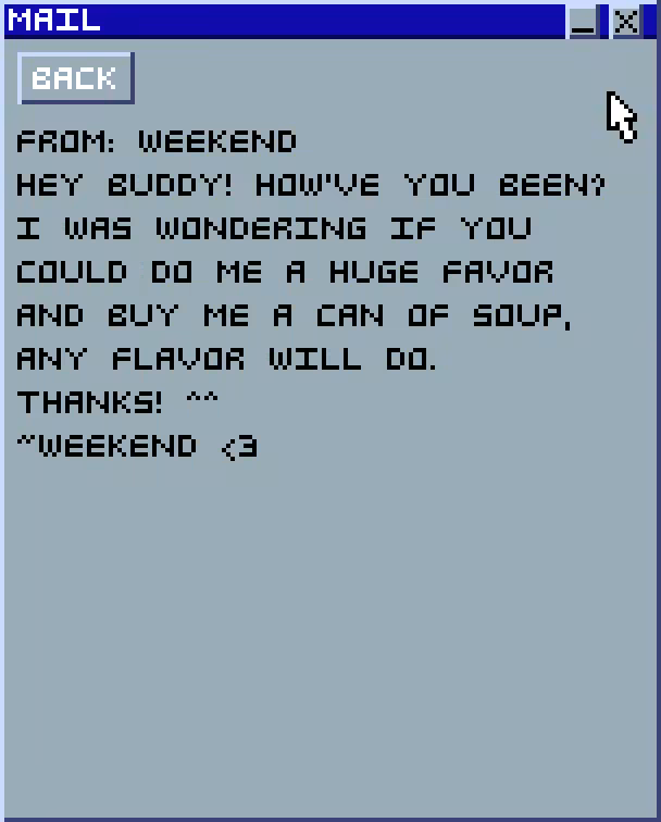 Heya! Long time no see. I just have a small -tiny- little favor to ask of you, could you buy me some soup? ...How? Well, that's for you to find out!