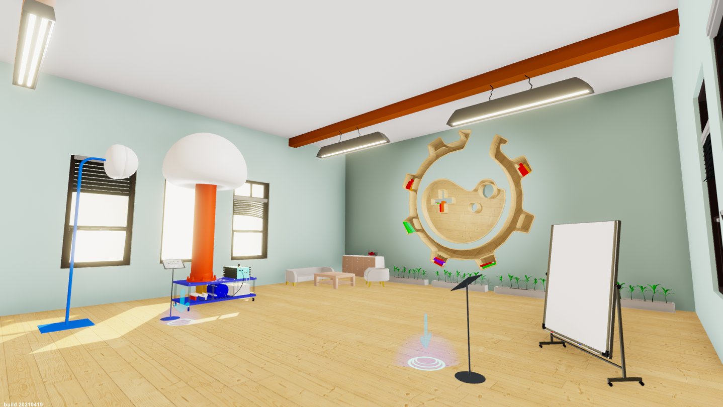 The main laboratory room consists of different experiment stations and acts as a three-dimensional menu. Choose any experiment to start. Currently, Maroon supports experiments from the fields of electromagnetism, electrostatics, oscillation, waves, analytical chemistry, and algorithms.