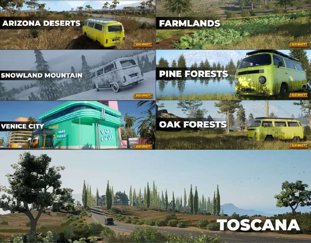 Design your dream caravan in detail, roam freely with your mobile home, set up your camp with friends, and enjoy music by the campfire in a vast open world!
