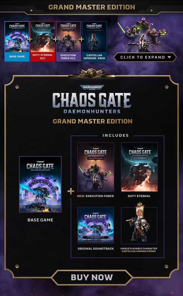 Warhammer 40,000: Chaos Gate - Daemonhunters - Grand Master Edition contains the acclaimed base game, Execution Force Pack, Duty Eternal Pack, and Castellan Champion Upgrade Pack.