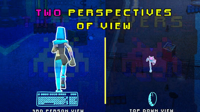 • Player 2 controls his character with a mouse and sees the game from a top-down perspective.