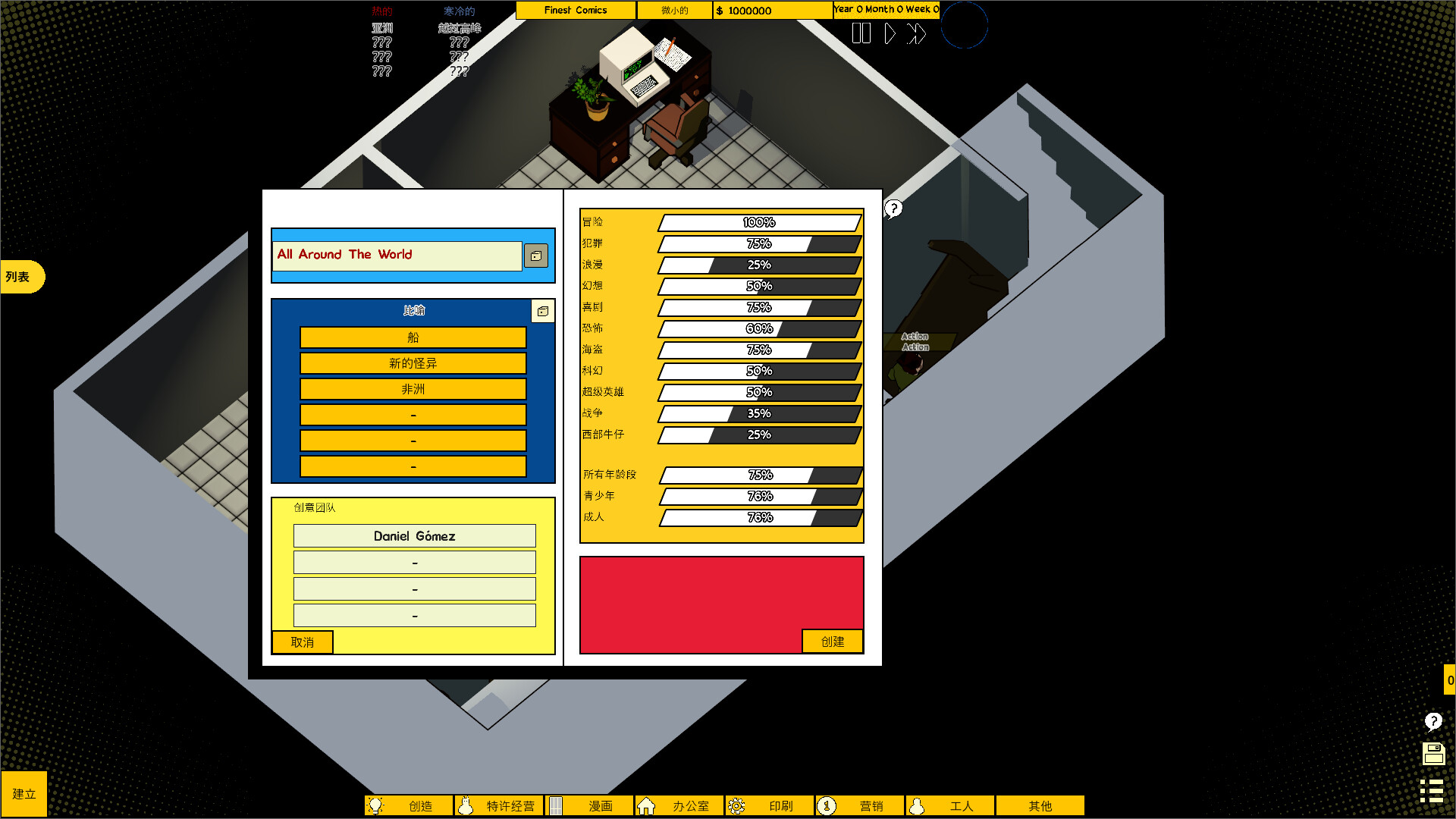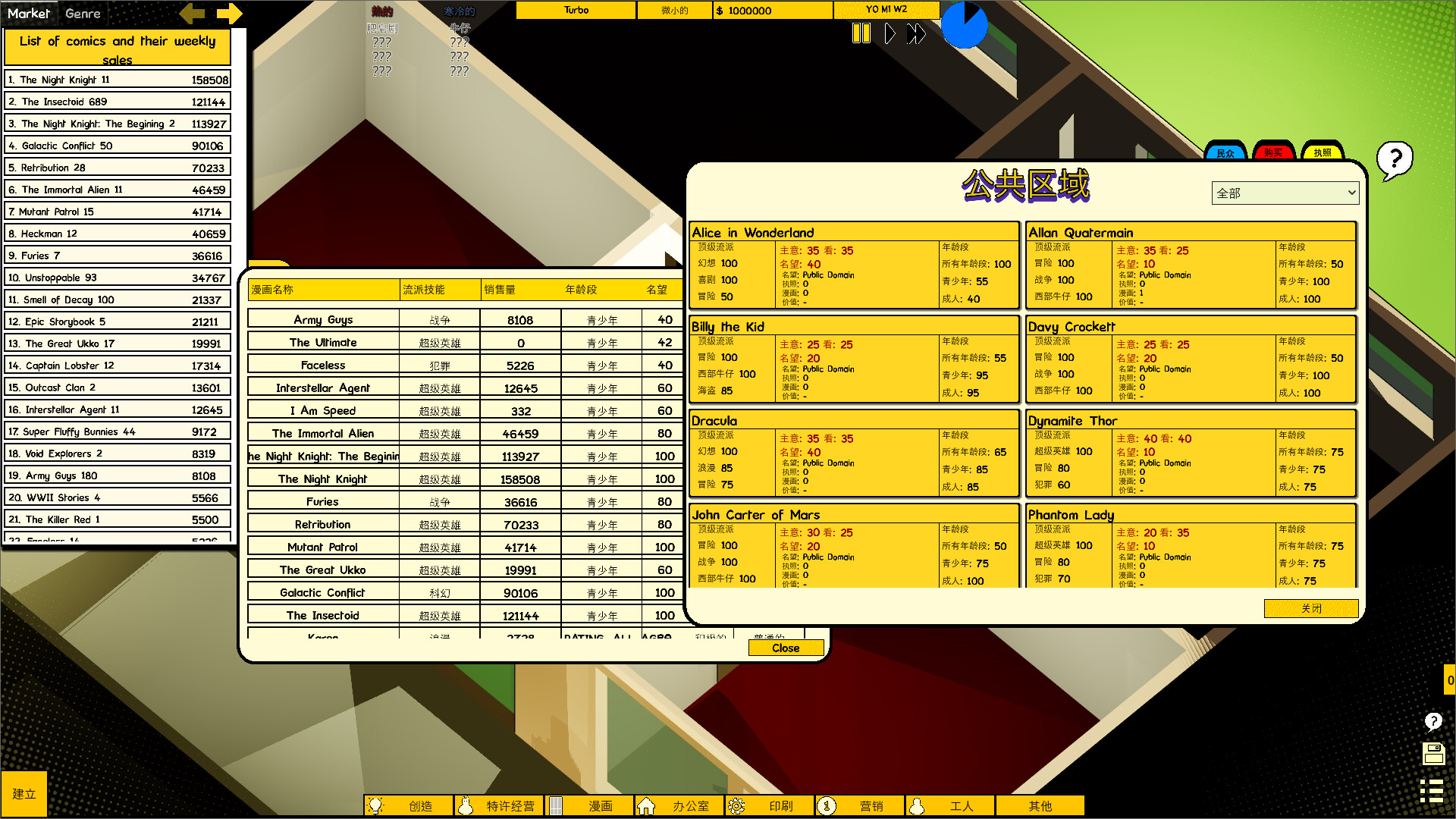 用你的漫画征服市场。它们可以基于您自己的想法,或者您可以购买经营权。通过决定它们应该是彩色的还是黑白的、它们有多少广告、它们印刷在什么样的纸张上、它们将运行多长时间以及它们发布的频率来定制它们。有更多的方法来调整它们,但如果你不想那么深入,游戏还允许你把它留给创作者