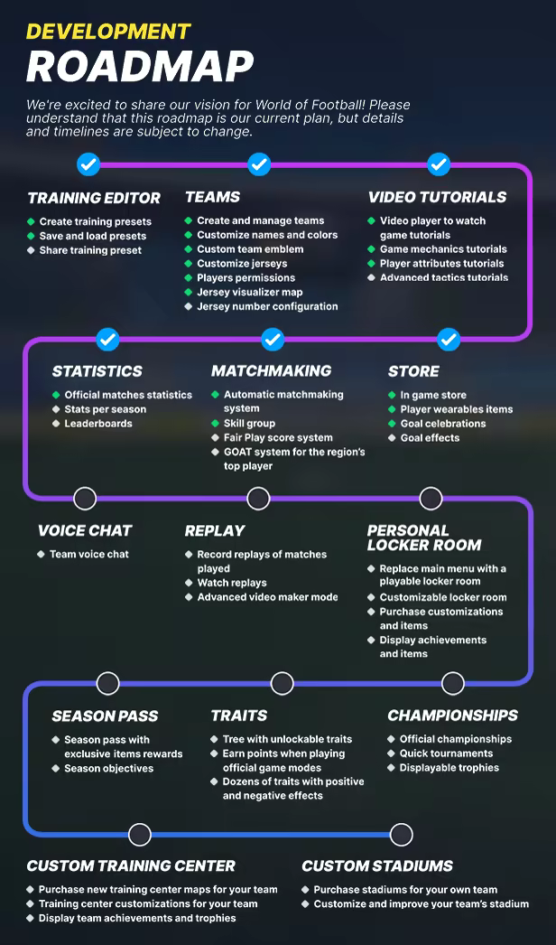 “We have LOTS of plans for World Of Football, which you can find detailed in our Roadmap, which is also available on our website. The game will remain in Early Access while we continue to refine and expand the experience and we are happy with the current status of the game. Core features like matchmaking, our in-game store, and other key systems are already live during Early Access. Now is the perfect time to jump in, as new major features are regularly introduced to enhance gameplay and build toward an exciting 1.0 launch! Check out our Roadmap for our vision.”