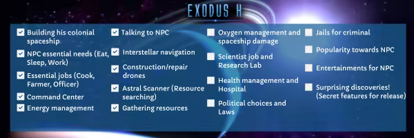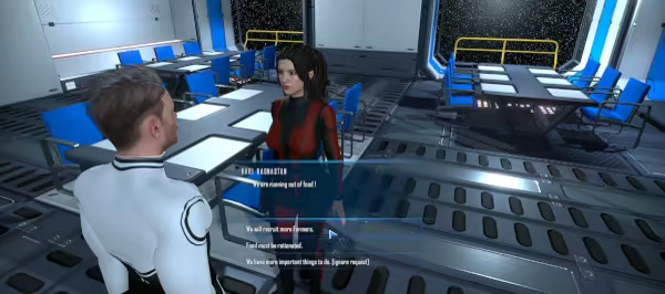 “At this moment, in this game you can choose your Space Commander avatar (male/female), build your colonial spaceship with essentials elements (bedroom, kitchen, farm pod, energy generator), manage resources and population, discuss with NPC and assign them jobs. Your have access to the first part of the main story mission to show you basic game mechanics.”