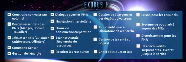 « Pour la sortie, vous pourrez appliquer vos propres règles avec des fonctionnalités politiques, ajouter plus d'emplois pour vos résidents (santé, militaire, ...), rechercher de nouvelles technologies avec la fonctionnalité laboratoire de recherche, dialoguer avec vos résidents pour satisfaire leurs demandes et augmenter votre popularité, ajoutez des divertissements pour vos résidents (bar, salle de jeux, etc ...), mais aussi des découvertes surprenantes dans l'espace! »