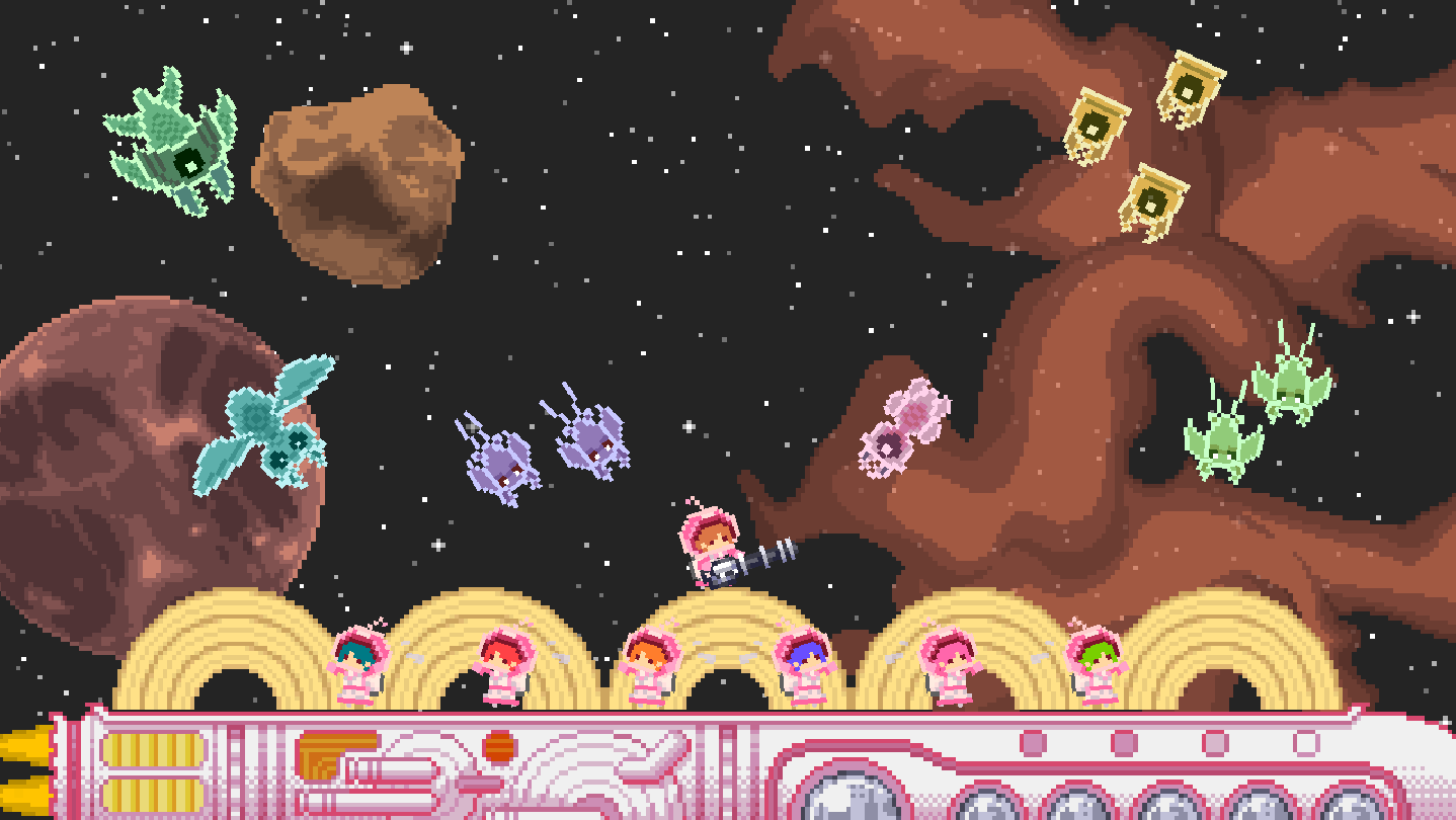The hungry invaders are approaching one after another, wanting the important Baumkuchen Cake carried by the spaceship for themselves.