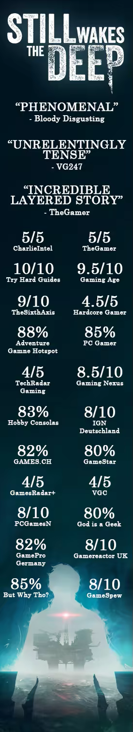 STILL WAKES THE DEEP est un retour au genre de l'horreur narrative en vue subjective pour The Chinese Room, créateur de jeux salués par la critique comme Amnesia: A Machine for Pigs, Everybody's Gone to the Rapture et Dear Esther.