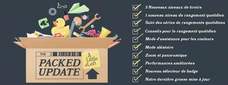 A Little to the Left propose désormais un archivage de casse-tête, qui vous permet d'accéder en permanence aux niveaux saisonniers qui étaient auparavant limités dans le temps. Profitez désormais de la pagaille sur le thème de Noël, de Pâques, d'Halloween et plus encore, à tout moment dans l'année.