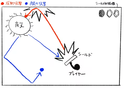 敵が発射した弾を盾で跳ね返し、五つのステージをクリアしていくゲームです。