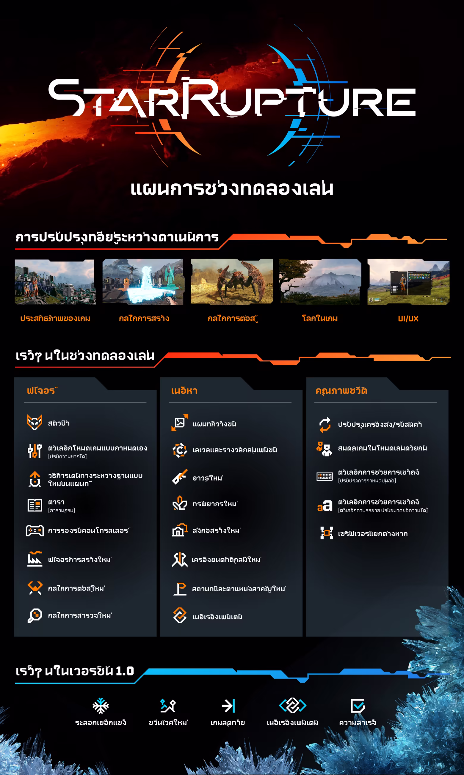 StarRupture คือเกมสร้างฐานแบบโลกเปิดมุมมองบุคคลที่หนึ่งที่มีระบบการต่อสู้สุดล้ำและพื้นที่ให้สำรวจมากมาย ที่คุณสามารถเล่นคนเดียวหรือเล่นเป็นกลุ่มในโลกที่บริสุทธิ์และเปลี่ยนแปลงตลอดเวลา สกัดและบริหารทรัพยากร, สร้างระบบอุตสาหกรรมที่ซับซ้อนของคุณ ตลอดจนต่อสู้กับฝูงอสุรกายต่างดาว