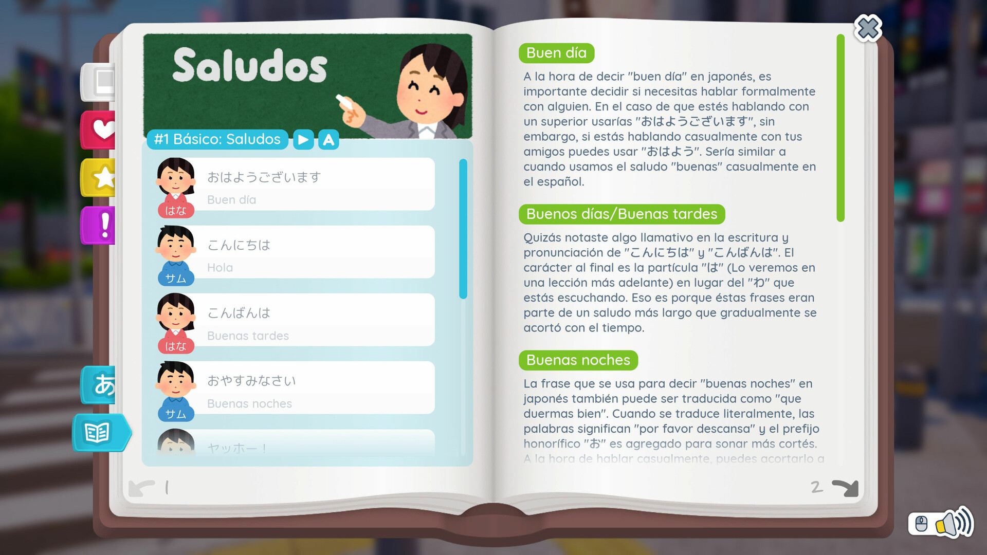 En la parte de atrás de tu álbum de fotos hay un montón de paginas de clases de japonés para principiantes que te enseñaran como hablar japonés y como usar el vocabulario aprendido en Shashingo. También están incluidas algunas palabras clave y frases importantes que pueden ayudarte en tus conversaciones futuras.