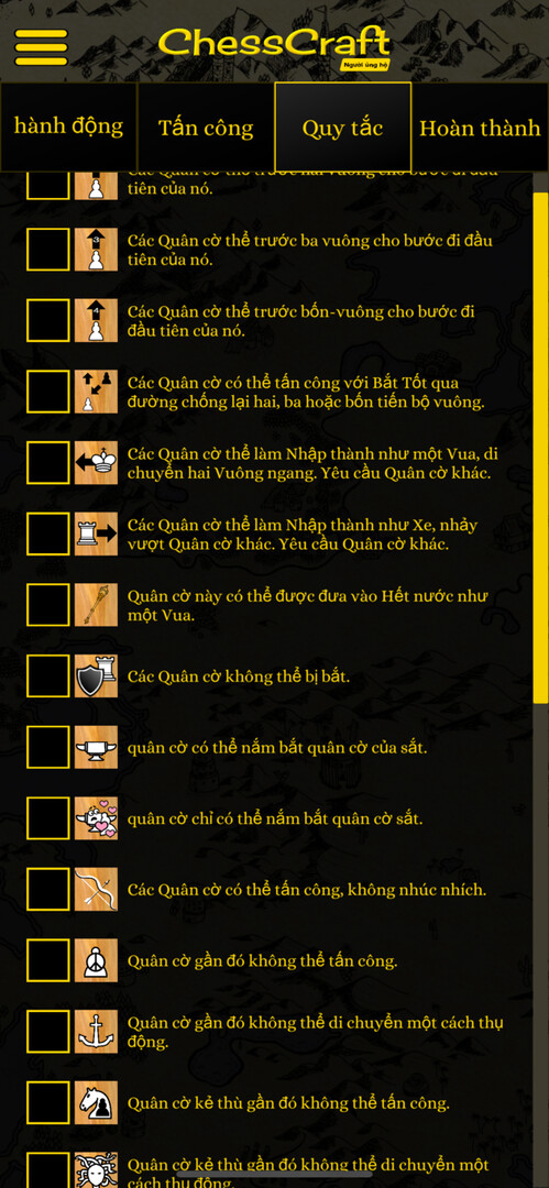 Không bao giờ chơi cùng một trò chơi cờ vua một lần nữa! Chesscraft là một hộp cát AI cờ. Tạo Cờ BanX, Quy tắc và Quân cờ của riêng bạn. Chơi với máy tính. Chơi với bạn bè của bạn trực tuyến. Kiếm được giải thưởng bằng cách chơi 80 trò chơi cờ khác nhau trong chế độ phiêu lưu.
