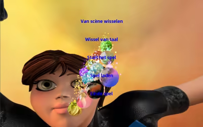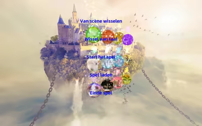 Het hoofdmenu bevat het wisselen van scène, het wisselen van taal, het starten van het spel, het laden van het spel en het beëindigen van het spel