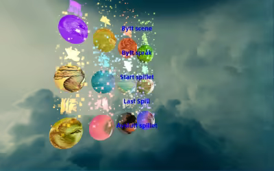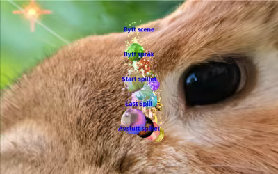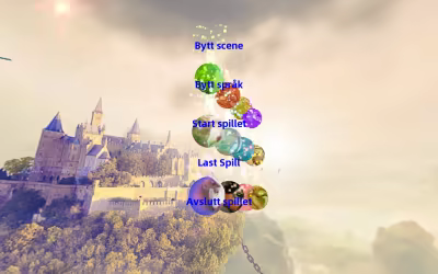 Hovedmenyen inkluderer å bytte scene, bytte språk, starte spillet, laste spillet og avslutte spillet
