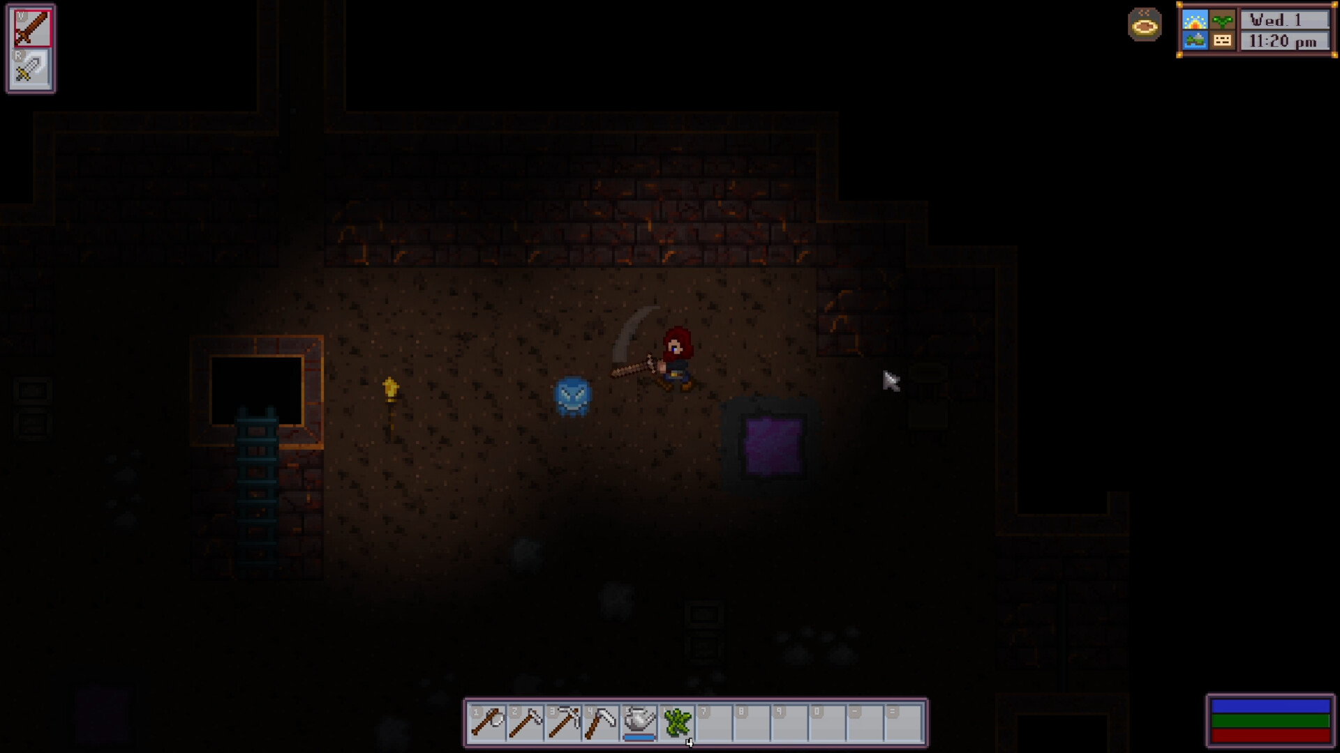 There are 2 villages to explore, 20 NPCs, 55 crafting recipes, 22 crafting machines, domesticated animals, 5 skill trees, a cooking system, randomly generated quests, 20 different crops to raise, randomly generated lairs, basic fishing with pole, over 30 different fish to catch, many items to forage (sea shells, flowers, herbs, etc), 3 areas of magic, and a variety of enemy types.
