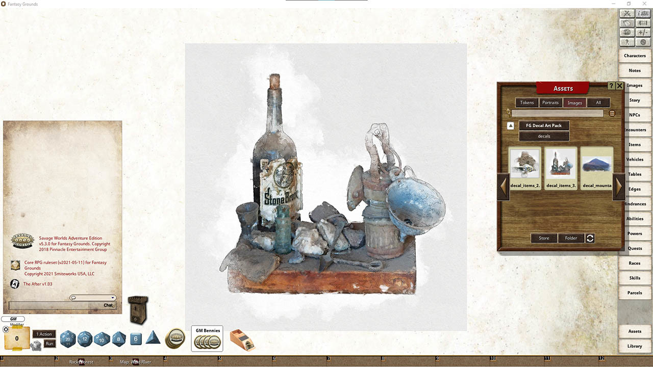 The Decal Art Pack features images and art produced by our in-house artist, Joshua Watmough. They have been optimized for use with Fantasy Grounds Unity and the new custom decal feature. This art package is specifically designed to help set the mood during play by changing the decal displayed on the FG desktop.