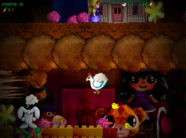 Billy-Bob used wind magic to try to steal the magic chicks so he could eventually sell their golden eggs but instead the winds scattered the chicks throughout the lands. You are a magical chicken named Sunny who decides to rescue the missing baby chickens.