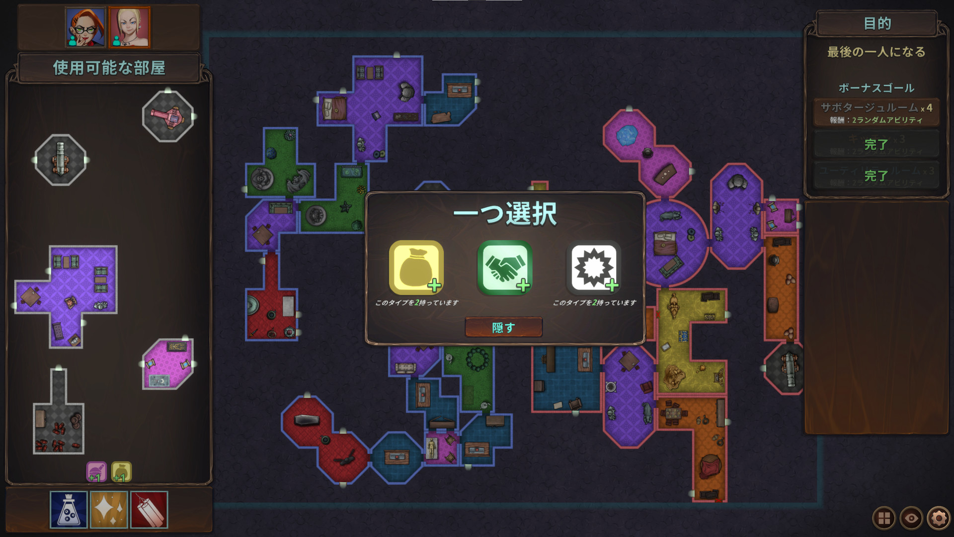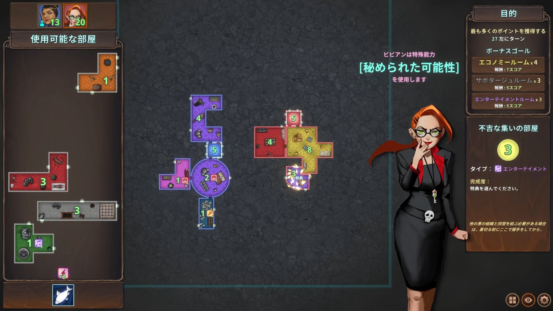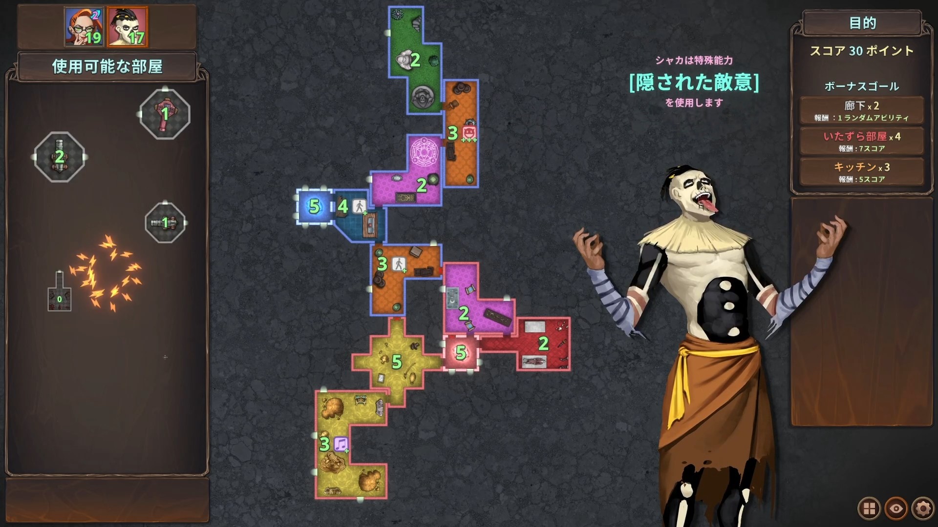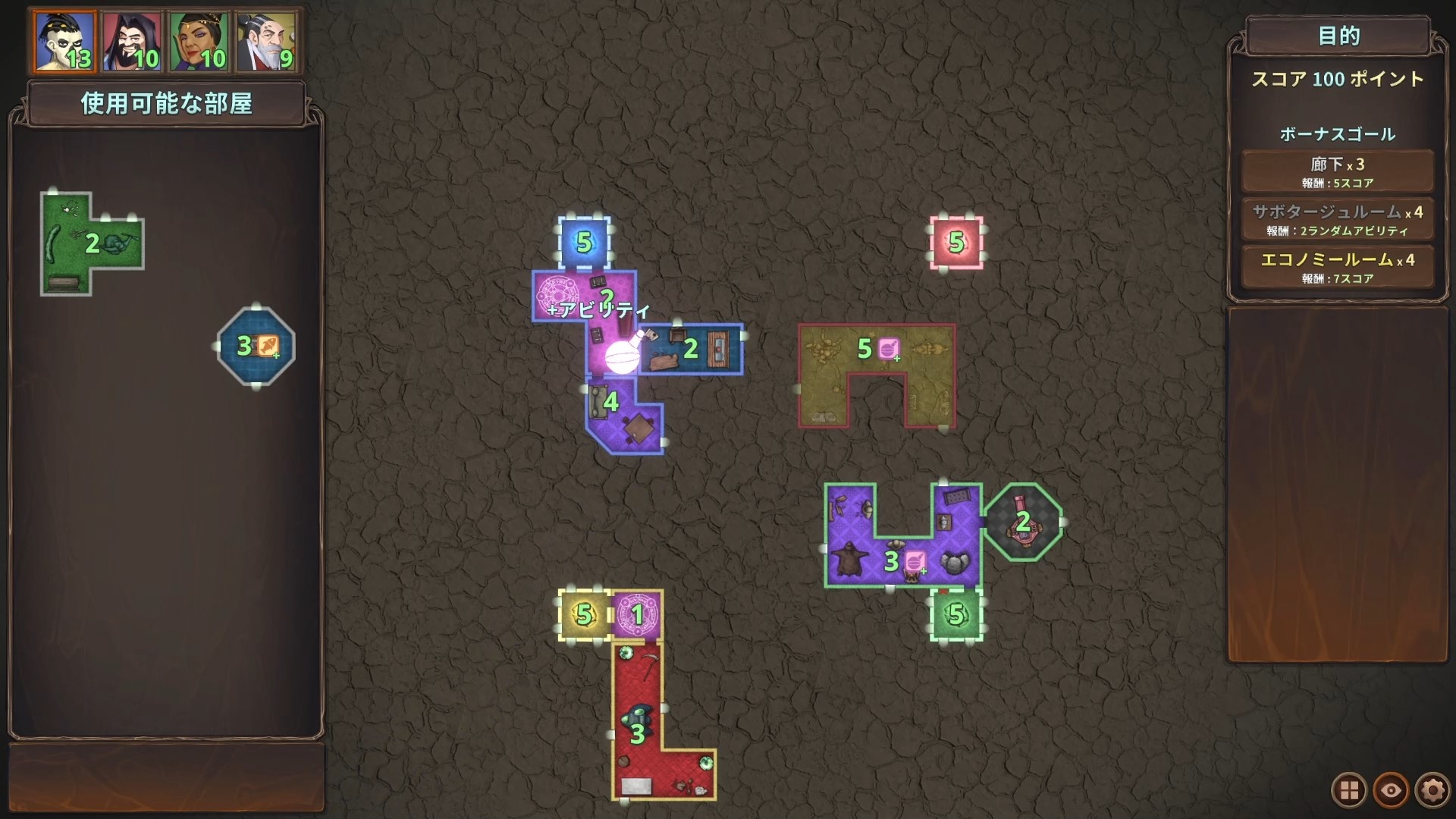 部屋によって、それぞれ独自の効果や隣人の好みがあります。最適な配置を見つけることで、相手に対して戦術的に優位に立ち、建築の持つポテンシャルを最大限に引き出すことができます。最適な配置を見つけることができれば、これほど嬉しいことはありません。