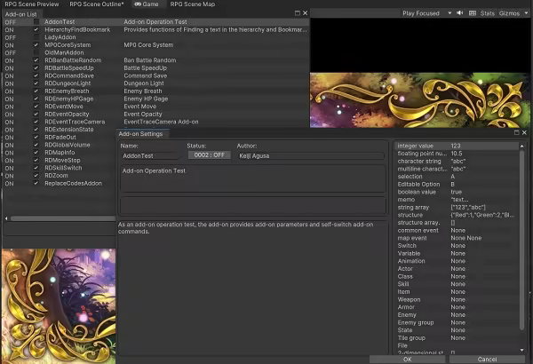In RPG Maker series, users have always been able to develop and use scripts known in the community as “plugins” to expand engine functionalities not available by default. In RPG MAKER UNITE, users can use “Addons” to enhance and expand the engine. We changed the name due to how the internal processing works differently from past RPG Makers, but the concept and usage is identical. However, please do note that like always, we cannot provide official support on the development or usage of Addons.