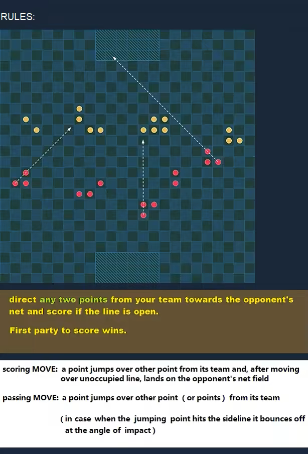 This game allows to create scoring opportunities from many angles simultaneously what makes for a dynamic and exciting play. Direct any two points from your team towards the opponent's net and score. First party to score wins. It also features three board designs with zoom.