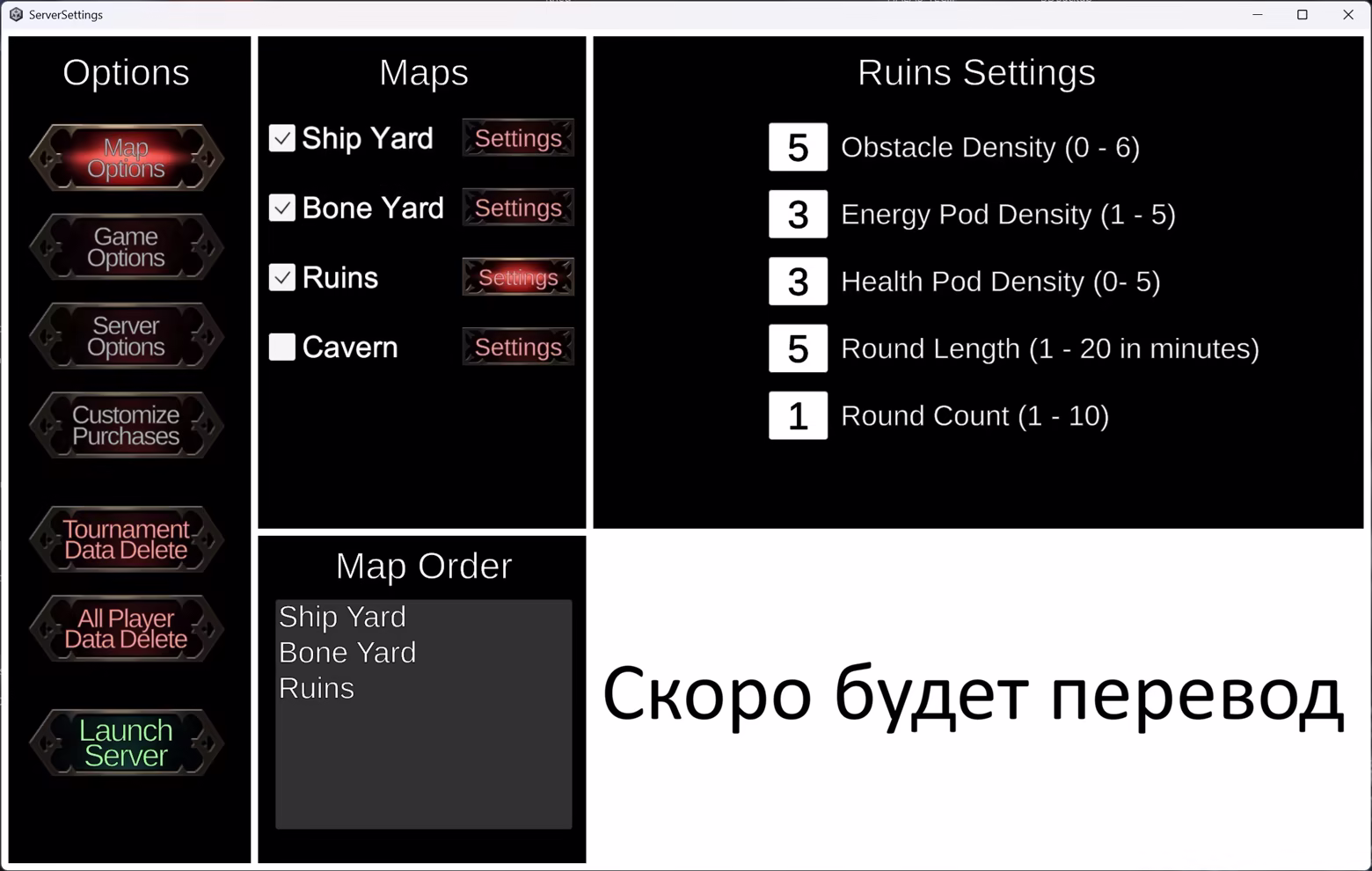 Игра "Krieg" построена на базе отдельных серверов и предлагает удобный интерфейс для настройки параметров и запуска вашего сервера. В то же самое время сам сервер не имеет графического интерфейса, отображая лишь самую важную информацию, например, о тех, кто присоединился к игре или покинул ее. Предусмотрена простая система блокировки игроков с четкими инструкциями. В новых обновлениях мы планируем реализовать систему для поиска и определения читеров с четким отображением причин блокировки. Используя интерфейс для настройки сервера, вы можете менять такие параметры карты, как продолжительность раунда, количество раундов до смены карты, а также плотность платформ перезарядки в игровом мире. Учитывая случайный характер размещения внутриигровых препятствий, сервер позволяет выбрать плотность их размещения на карте.