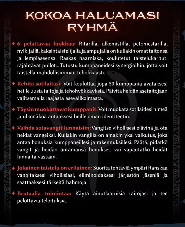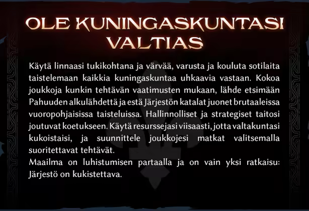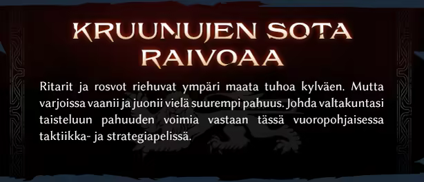 Kruunujen sota raivoaa. Ritarit ja rosvot riehuvat ympäri maata tuhoa kylväen. Käytä linnaasi tukikohtana ja nouse lordiksi, joka johtaa taistelua pahuuden voimia vastaan tässä vuoropohjaisessa taktiikka- ja strategiapelissä.