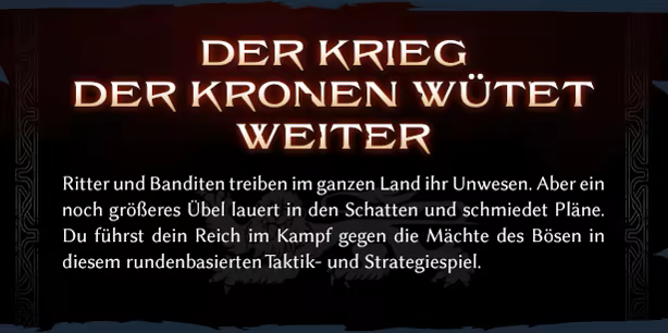 Der Krieg der Kronen wütet weiter. Ritter und Banditen treiben im ganzen Land ihr Unwesen und säen Zerstörung. Erhebe dich von deiner Burg aus zum Fürsten, der in diesem rundenbasierten Taktik- und Strategiespiel den Kampf gegen die Mächte des Bösen anführt.