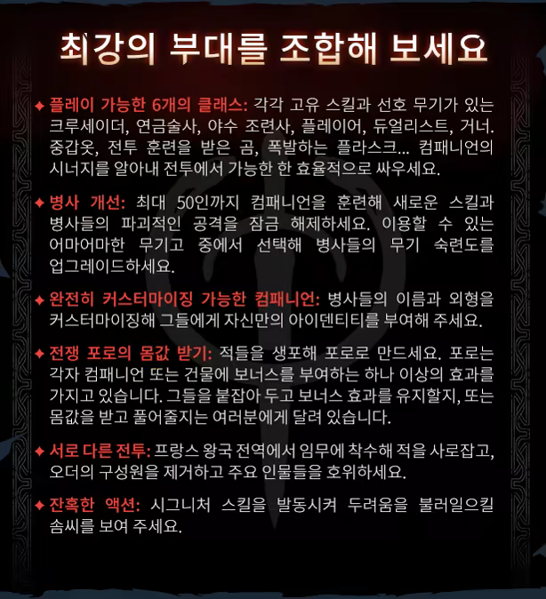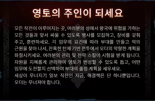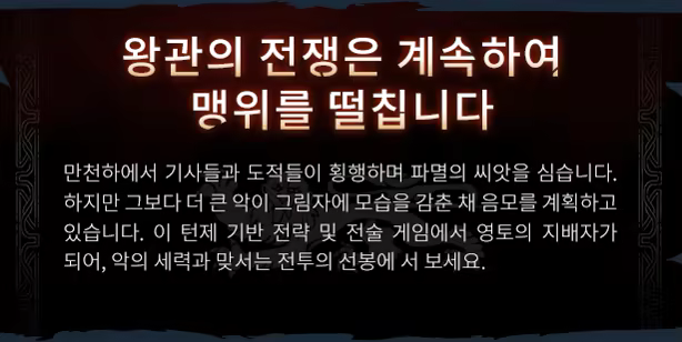 왕관의 전쟁은 계속하여 맹위를 떨칩니다. 만천하에서 기사들과 도적들이 맹위를 떨치며 파멸의 씨앗을 심습니다. 턴제 기반 전략 및 전술 게임에서 성을 기반으로 세력을 일으켜 삼아 악의 세력과 맞서 전투를 이끄는 군주가 되어 보세요.
