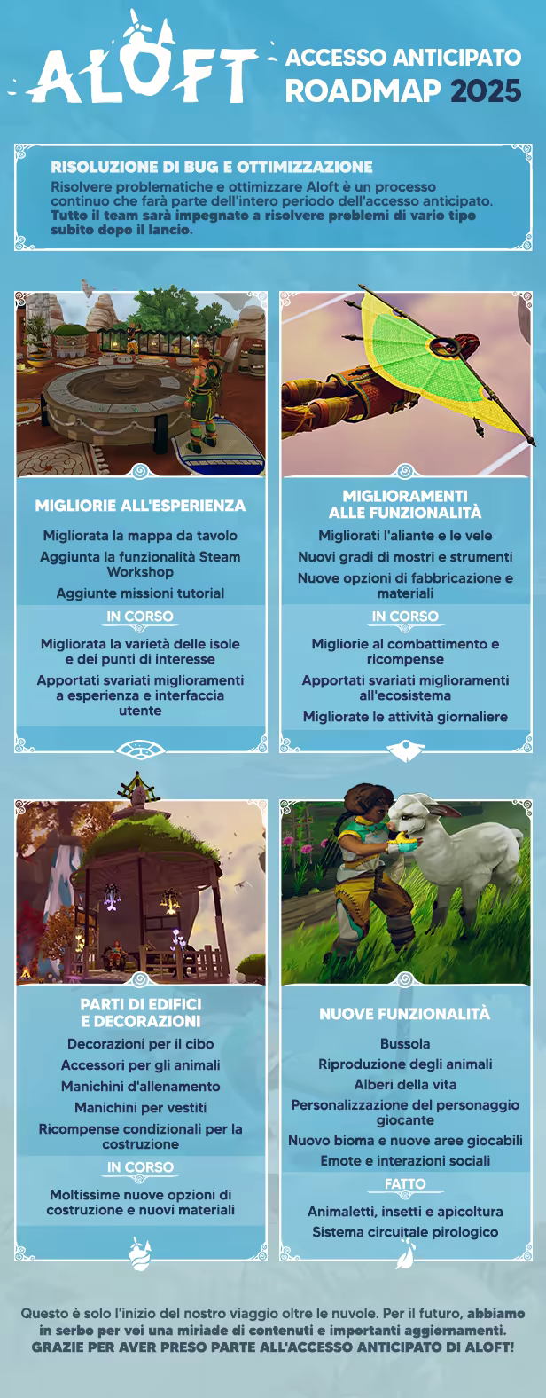 “Abbiamo moltissimi contenuti in serbo per Aloft. Il nostro obiettivo è includere delle nuove meccaniche di gioco, più biomi esplorabili, eventi meteorologici, tipi di edifici, sfide da superare e molto altro. Inoltre, vogliamo implementare soluzioni che migliorino l'esperienza, come l'ottimizzazione e nuove interfacce utente. Ma soprattutto, quando avrete finalmente il gioco in vostro possesso, potrete fornirci una marea di informazioni su ciò che funziona e ciò che necessita di miglioramento. In questo modo potremo pubblicare una versione completa con più contenuti, che saranno poi ulteriormente rifiniti attraverso il feedback e le interazioni della community.”