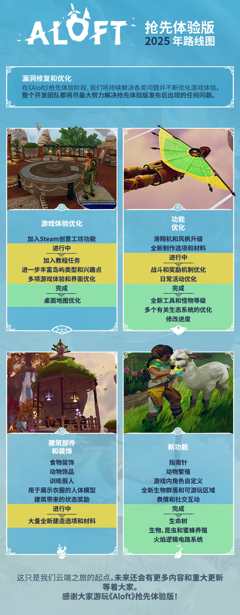 “我们计划在《Aloft》中添加大量内容。我们计划在游戏中加入全新的游戏机制,以及更多可供探索的生物群落、气象事件、建筑类型、需要努力克服的挑战等等。我们还打算进一步打磨游戏质量,例如提供优化和全新的用户界面。更重要的是,在将游戏交到大家手里以后,我们可以获得大量信息,了解哪些内容会受到欢迎,以及哪些内容需要改进。这有助于我们根据社区反馈对游戏进行迭代,从而大幅提升游戏体验,进而打造内容更加丰富的完整版游戏。”