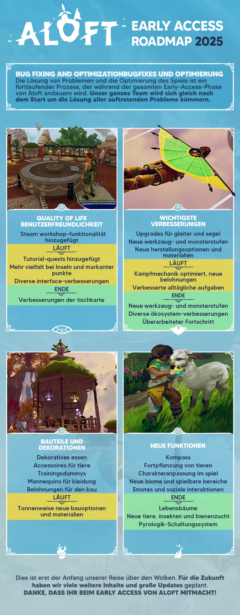 „Wir haben viele Inhalte für Aloft geplant. Es ist geplant, das Spiel um brandneue Spielmechaniken, weitere erkundbare Biome, Wetterereignisse, zusätzliche Bauarten, Herausforderungen und vieles mehr zu erweitern. Außerdem planen wir weitere Optimierungen der Bedienung und neue Benutzeroberflächen. Am wichtigsten ist, dass ihr das Spiel selbst ausprobiert, um uns darüber zu informieren, was funktioniert und was verbessert werden sollte. Das wird uns helfen, die Vollversion des Spiels mit mehr Inhalten zu versehen und mithilfe des Feedbacks der Community und wiederholter Überarbeitung zu optimieren.“