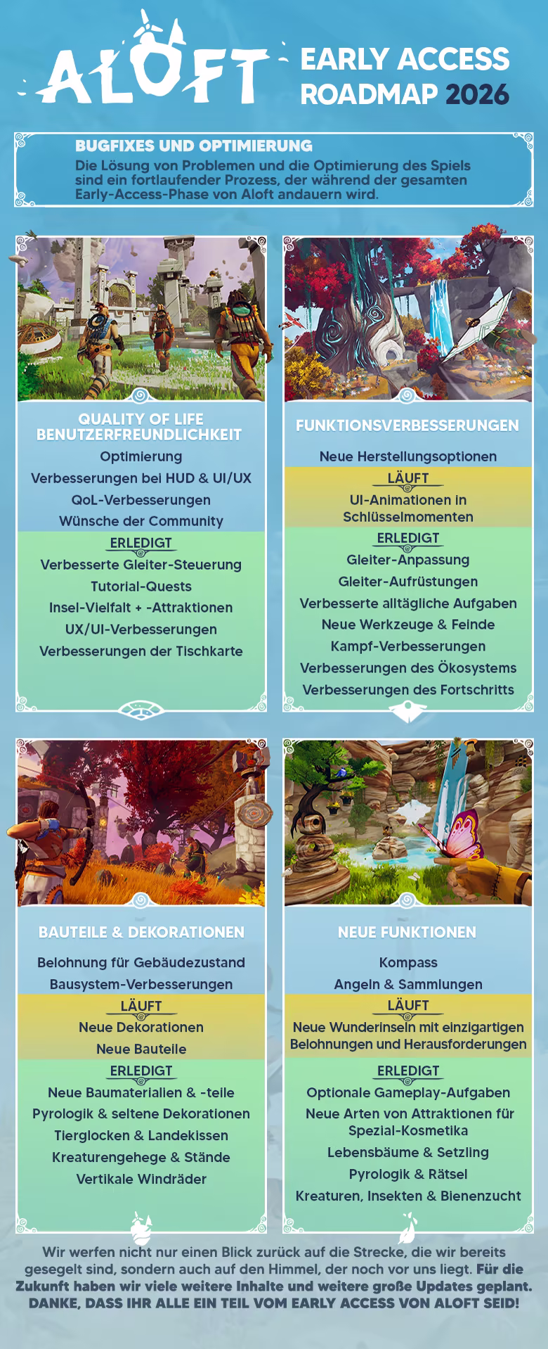 „Wir haben viele Inhalte für Aloft geplant. Es ist geplant, das Spiel um brandneue Spielmechaniken, weitere erkundbare Biome, Wetterereignisse, zusätzliche Bauarten, Herausforderungen und vieles mehr zu erweitern. Außerdem planen wir weitere Optimierungen der Bedienung und neue Benutzeroberflächen. Am wichtigsten ist, dass ihr das Spiel selbst ausprobiert, um uns darüber zu informieren, was funktioniert und was verbessert werden sollte. Das wird uns helfen, die Vollversion des Spiels mit mehr Inhalten zu versehen und mithilfe des Feedbacks der Community und wiederholter Überarbeitung zu optimieren.“