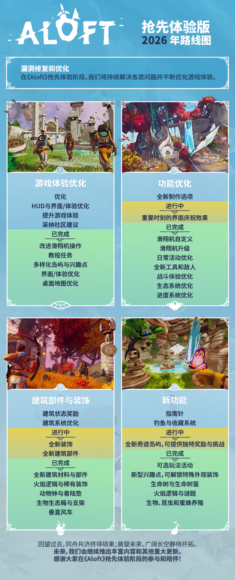 “我们计划在《Aloft》中添加大量内容。我们计划在游戏中加入全新的游戏机制,以及更多可供探索的生物群落、气象事件、建筑类型、需要努力克服的挑战等等。我们还打算进一步打磨游戏质量,例如提供优化和全新的用户界面。更重要的是,在将游戏交到大家手里以后,我们可以获得大量信息,了解哪些内容会受到欢迎,以及哪些内容需要改进。这有助于我们根据社区反馈对游戏进行迭代,从而大幅提升游戏体验,进而打造内容更加丰富的完整版游戏。”