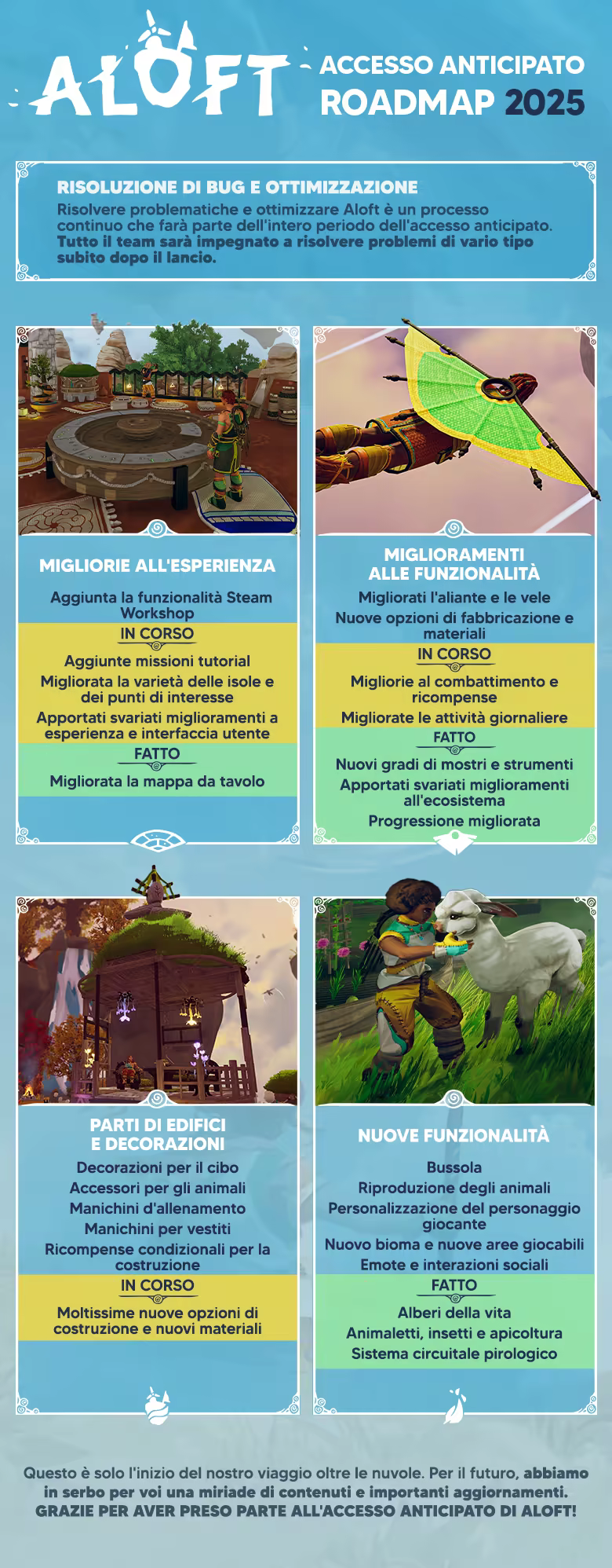 “Abbiamo moltissimi contenuti in serbo per Aloft. Il nostro obiettivo è includere delle nuove meccaniche di gioco, più biomi esplorabili, eventi meteorologici, tipi di edifici, sfide da superare e molto altro. Inoltre, vogliamo implementare soluzioni che migliorino l'esperienza, come l'ottimizzazione e nuove interfacce utente. Ma soprattutto, quando avrete finalmente il gioco in vostro possesso, potrete fornirci una marea di informazioni su ciò che funziona e ciò che necessita di miglioramento. In questo modo potremo pubblicare una versione completa con più contenuti, che saranno poi ulteriormente rifiniti attraverso il feedback e le interazioni della community.”