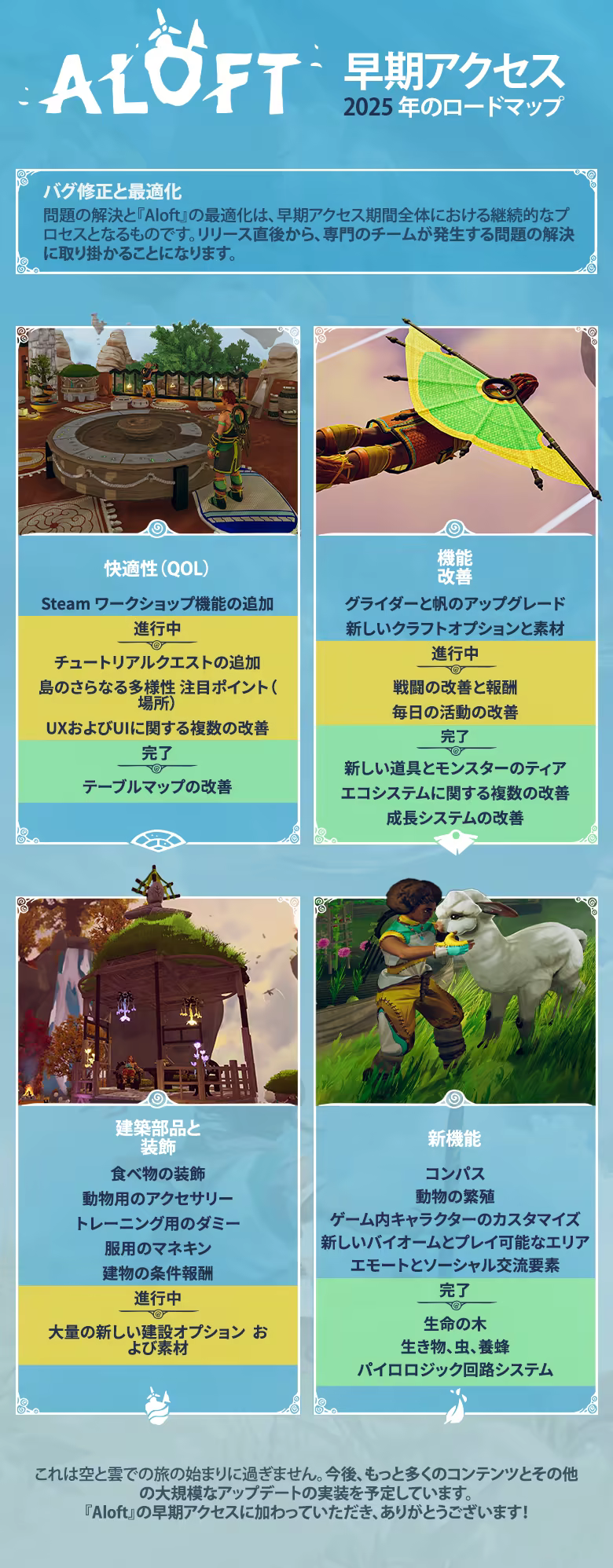 “『Aloft』では大量のコンテンツが予定されています。新しいゲームシステム、より多くの探索可能なバイオーム、気象イベント、建設タイプ、克服すべきチャレンジ、他にも多くの要素を含むものとなります。また、最適化や新しいユーザーインターフェースなどの快適性(QoL)改善も含まれます。最も重要なことは、ゲームをプレイヤーの皆さんのもとにお届けすることで、何が上手くいっていて、何に改善が必要なのかという大量の情報がもたらされることです。これは、はるかに多くのコンテンツを備え、コミュニティフィードバックと複数のバージョンを介してより洗練された製品版を提供することの助けとなります。”