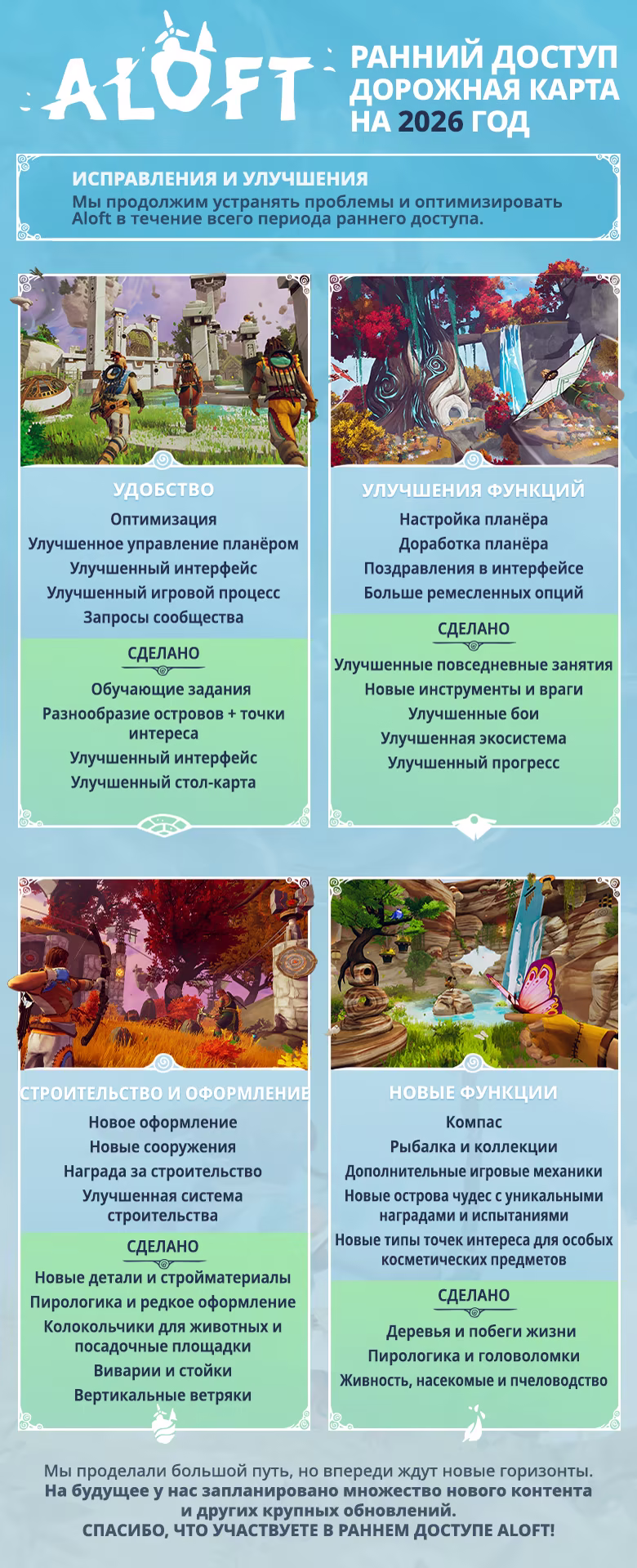 «У нас большие планы на Aloft. Мы планируем добавить в игру принципиально новые механики и биомы, метеорологические явления, виды построек, испытания и многое другое, а также внести ряд усовершенствований — например, улучшить оптимизацию и обновить пользовательский интерфейс. Более того, предоставив вам игру прямо сейчас, мы сможем получить массу полезной информации о её достоинствах и недостатках. Это поможет нам расширить полную версию игры, которая будет значительно улучшена в несколько этапов благодаря отзывам сообщества.»