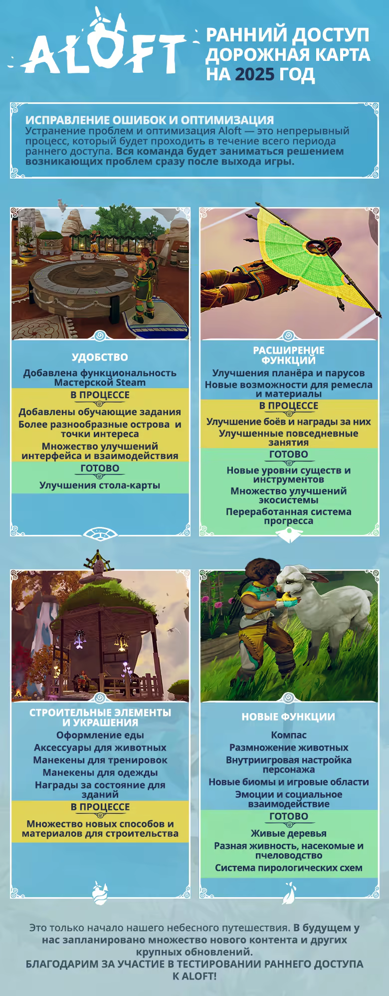 «У нас большие планы на Aloft. Мы планируем добавить в игру принципиально новые механики и биомы, метеорологические явления, виды построек, испытания и многое другое, а также внести ряд усовершенствований — например, улучшить оптимизацию и обновить пользовательский интерфейс. Более того, предоставив вам игру прямо сейчас, мы сможем получить массу полезной информации о её достоинствах и недостатках. Это поможет нам расширить полную версию игры, которая будет значительно улучшена в несколько этапов благодаря отзывам сообщества.»