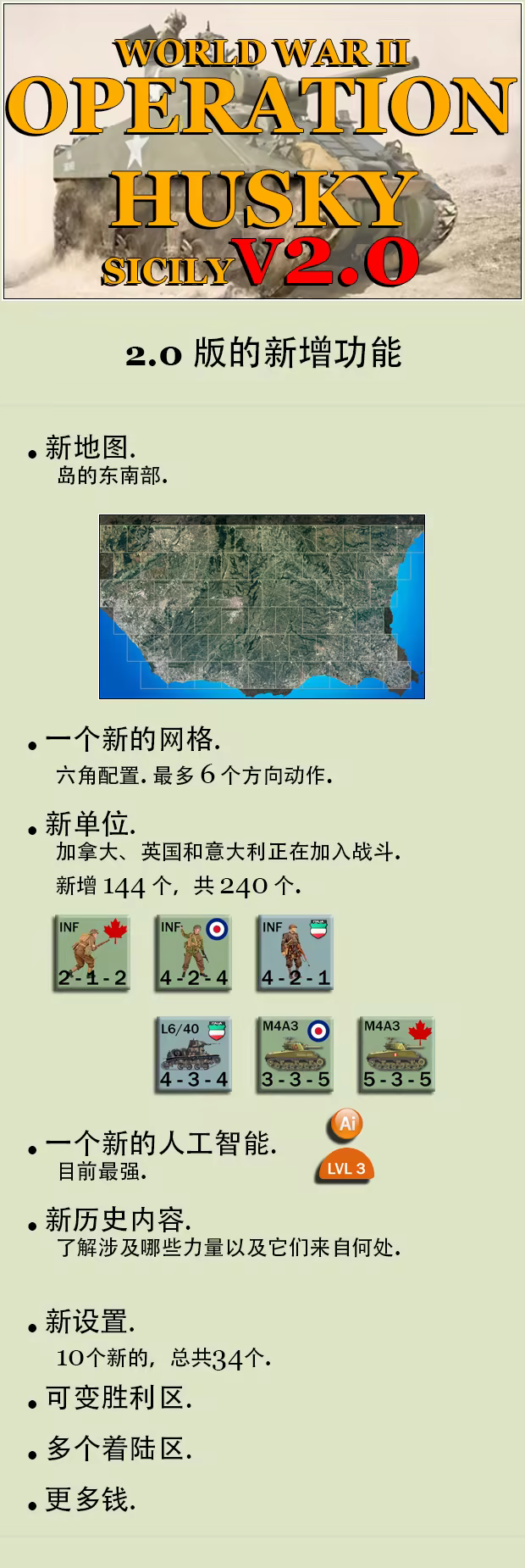 “第二次世界大战哈士奇行动是一款易于上手的回合制策略战争游戏, 拥有诸多单位可以控制. 简单明了的用户界面, 大量的任务内容, 快来试试吧!”