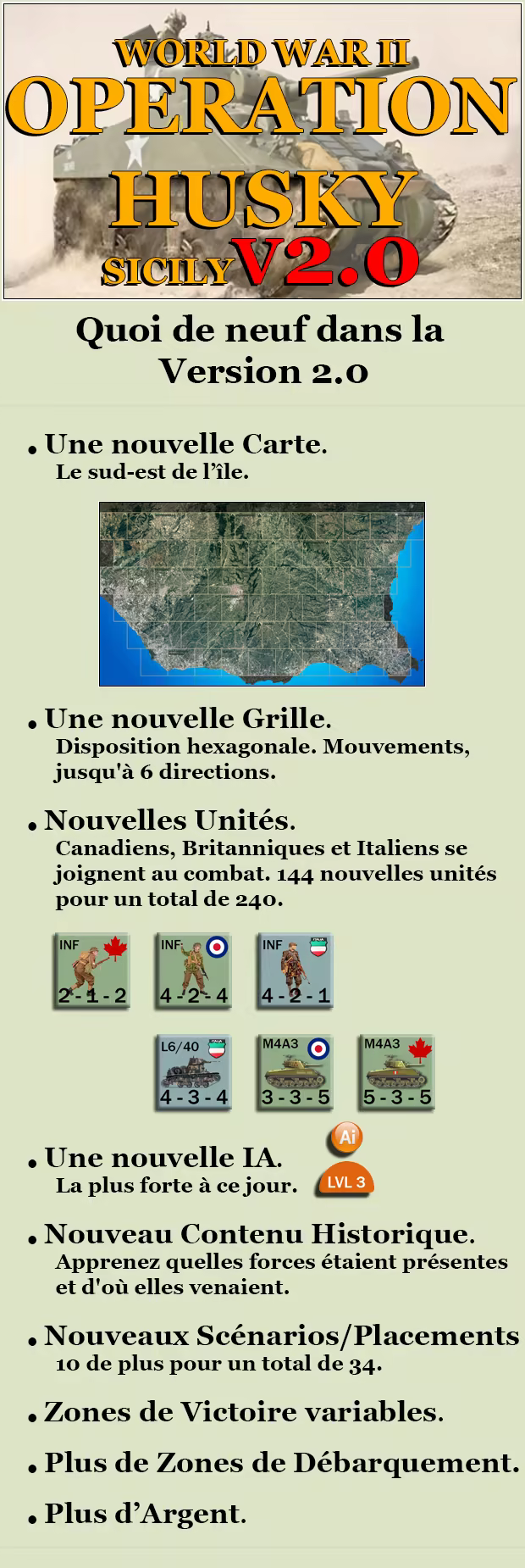 “World War 2 Operation Husky" est un wargame de stratégie au tour par tour accessible avec diverses unités à gérer, une interface utilisateur simple et claire, une bonne variété de missions à accomplir, essayez-le !”