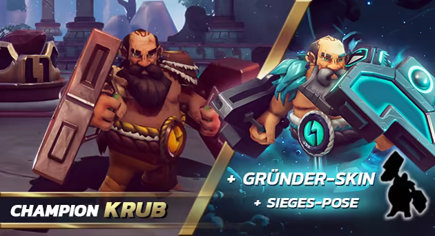 Krub ist ein Wächter an vorderster Front, der seine Verbündeten im Kampf beschützt und unterstützt. Mit einem Schild an jeder Hand fungiert er als Beschützer der Feinde verdrängt und kontrolliert. Schalte ihn zusammen mit einem einzigartigen und limitierten Gründer-Skin und einem Vorsprung in die Early-Access-Phase frei. Die Übergabe des Gründerpaketes findet zum Start des Early Access statt.