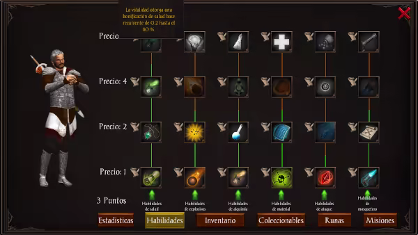 Desarrolla a tu personaje a través del árbol de habilidades, gana poderosas bonificaciones recogiendo runas y mejora las habilidades básicas. Invierte en la senda de explosivos, la senda de ataque, la senda de salud, la senda de alquimia, la senda de materiales o en la rama del árbol de habilidades específicas del personaje.