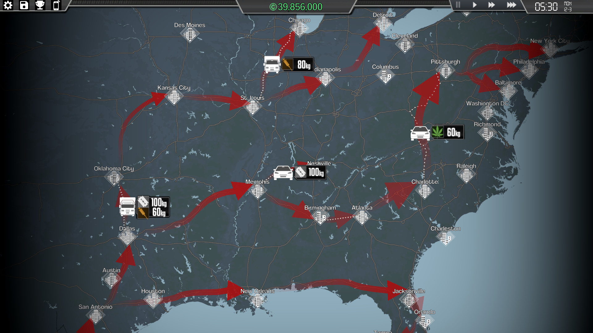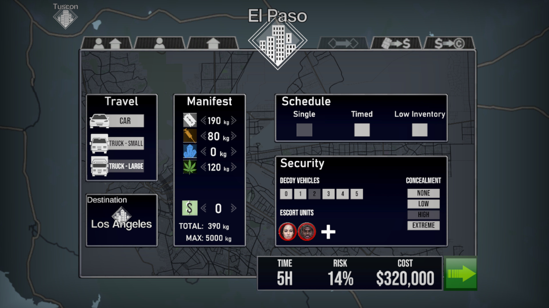 Every shipment comes with a risk of seizure by the authorities, or hijacking by a rival, but when a shipment gets through the rewards are enormous. You must decide how to reduce the risk, with simple measures such as decoy cars or concealment, or buying shell companies to transport cargo across the country.