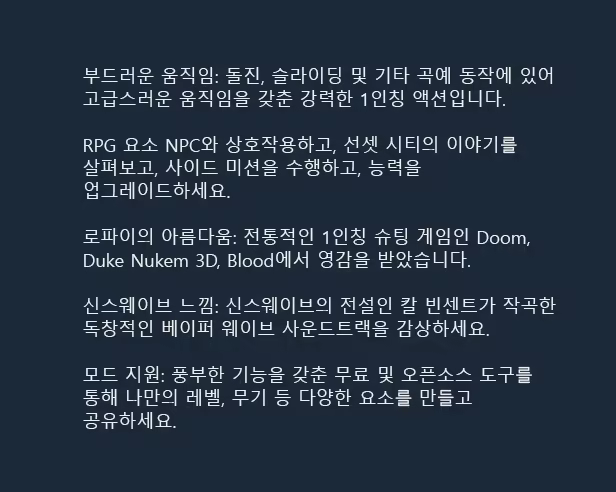 풍부한 스토리와 RPG 요소를 갖춘 사이버펑크 1인칭 슈팅 게임입니다. 여러분은 잃어버린 기억을 찾는 강화된 길거리 사무라이인 루시가 됩니다. 야쿠자, 좀비, 로봇 및 보스가 지배하는 상호작용할 수 있는 거대한 개방형 레벨에서 싸우세요.