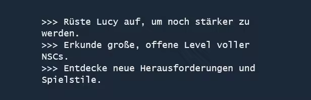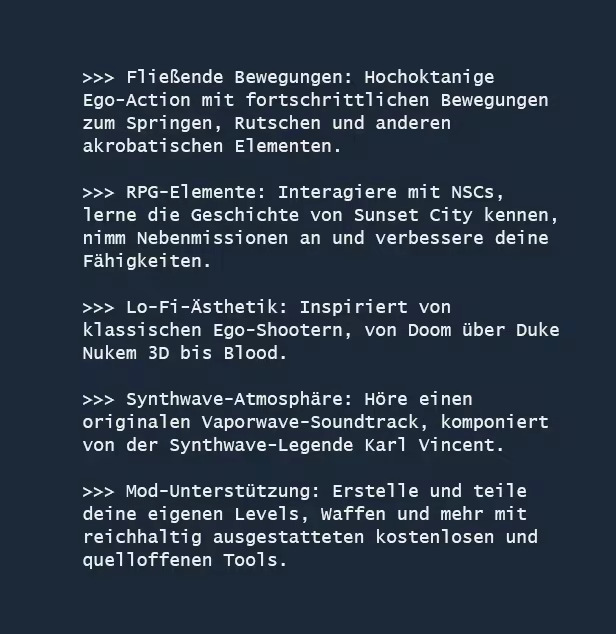Cyberpunk-Ego-Shooter mit einer fesselnden Geschichte und RPG-Elementen. Du bist Lucy, ein verbesserter Straßensamurai auf der Suche nach verlorenen Erinnerungen. Kämpfe in großen, offenen, interaktiven Levels, die von Yakuza, Zombies, Robotern und Bossen überrannt werden!