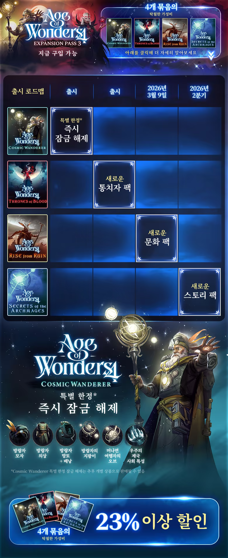 Age of Wonders 4에서 나만의 판타지 세계를 지배하라! 4X 전략과 턴제 전술 전투를 합친 Age of Wonders의 시스템과 함께 새 마법 세계를 탐험하세요. 턴을 진행하는 동안 제국을 확장하며 자신의 세력을 양성하고 변모시켜야 합니다.