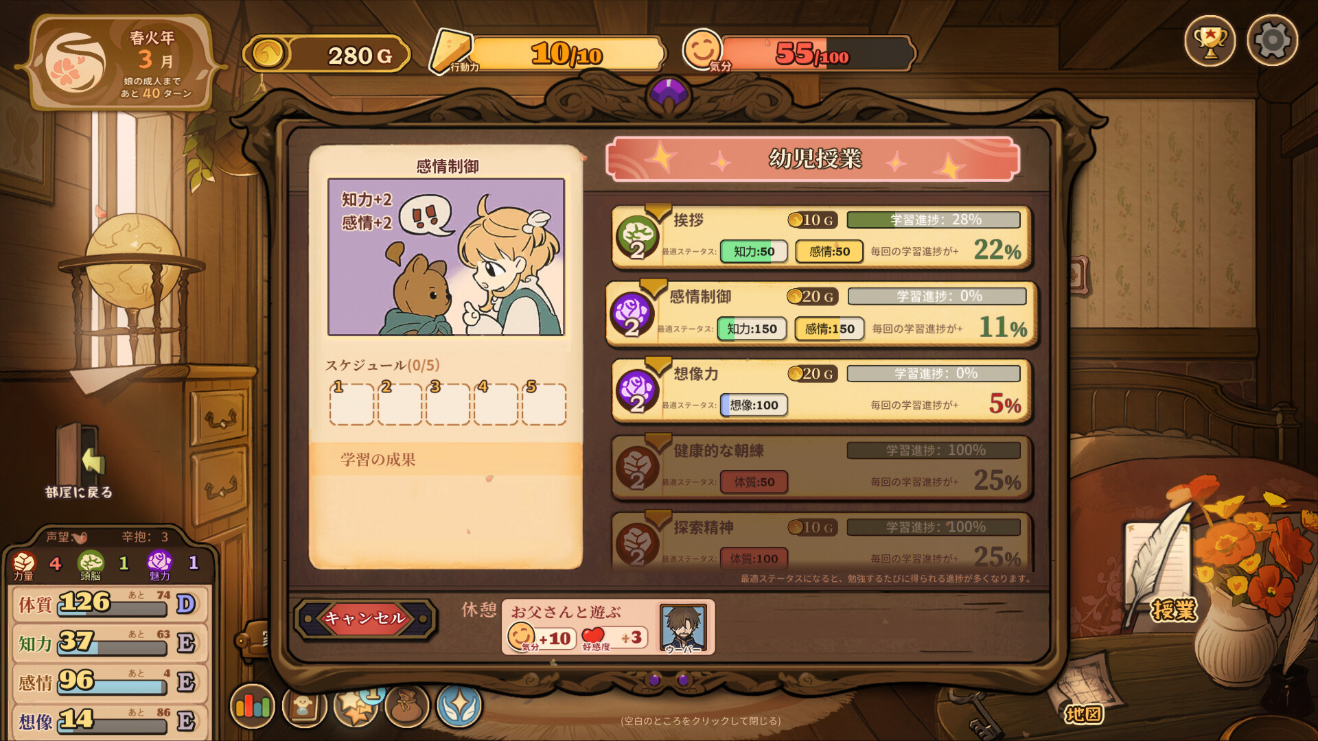 農業、料理、釣り、ギャンブル、決闘、演劇、舞踏、競馬、裏路地など、プレイヤーは自分の好みに合わせて娘を育てることができます。