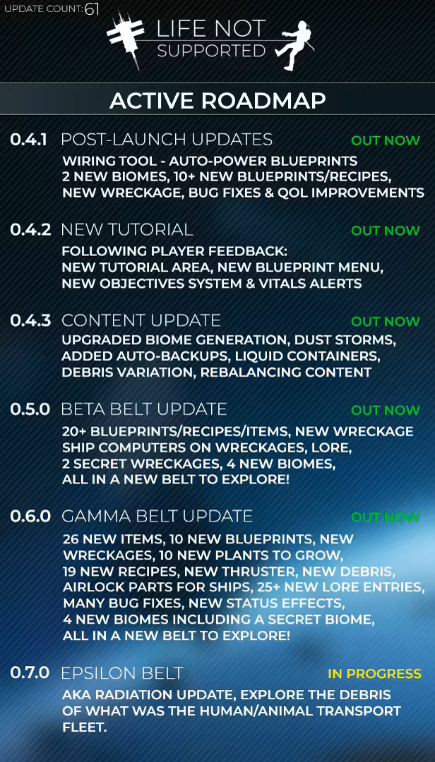 “The community is at the centre of development of any good game, especially in this genre. As such, the major decisions during development will be communicated and discussed within the Steam Community forum as well as the Life Not Supported specific Discord. This is also a public space for players to discuss changes that they want in the game - whether it be alterations to current design, completely new suggestions to be implemented, or bugs that they have encountered.