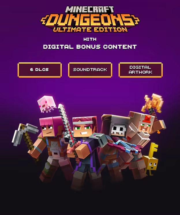 Experience the complete story of Minecraft Dungeons from the beginning to the End. Grab the Ultimate Edition which includes the base game and all six DLCs: Jungle Awakens, Creeping Winter, Howling Peaks, Flames of the Nether, Hidden Depths, and Echoing Void–all at a lower price than purchasing the game and each DLC separately.