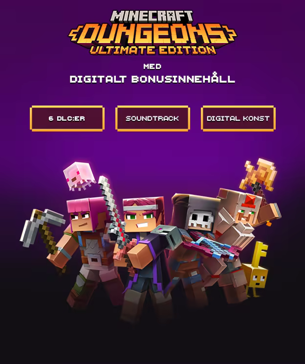 Upplev hela historien om Minecraft Dungeons från början till slutet. Skaffa Ultimate Edition, som innehåller grundspelet och alla sex DLC:er: Djungeln vaknar, Den krypande vintern, Ylande toppar, Nethers lågor, De dolda djupen och Ekande tomrummet till ett lägre pris än om du köper dem separat.