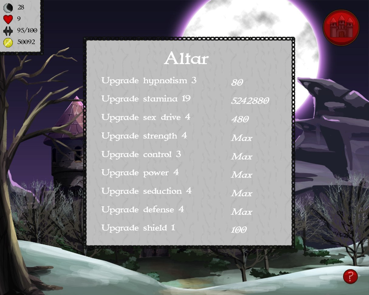 Vampire Revenge is an adult 2D game developed by Gaweb Studio. Play as a weakened vampire lord and fight your way to the top, either by fighting or seducing. Includes the following themes : blood sucking, hypnotism, fight, animated sex, maze exploration, power-ups and more!